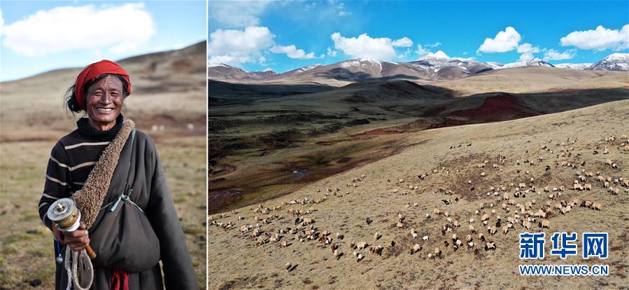 拼版照片:左圖為西藏昌都市貢覺(jué)縣拉妥鄉(xiāng)宗巴村村民多吉;右圖為在貢覺(jué)縣阿旺鄉(xiāng)牧場(chǎng),多吉幫一位綿羊養(yǎng)殖大戶(hù)放牧(無(wú)人機(jī)照片)。多吉自家有20只羊和10頭牛,之前一直在村里放牧。2019年他來(lái)到阿旺鄉(xiāng)幫綿羊養(yǎng)殖大戶(hù)放牧,每月有3900元的收入(5月2日攝)。