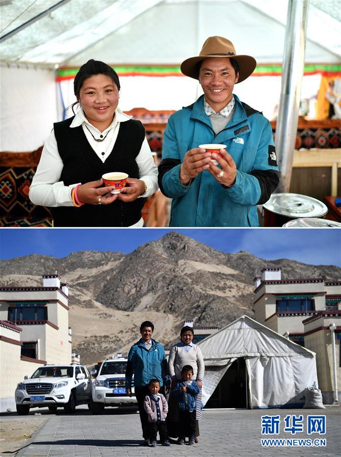 拼版照片上圖:在森布日極高海拔地區(qū)生態(tài)搬遷安置點(diǎn),格多(右)和妻子洛巴在展示自家打的酥油茶;下圖:在森布日極高海拔地區(qū)生態(tài)搬遷安置點(diǎn),格多(后左)和妻子洛巴及大兒子扎西尼瑪(前右)、小兒子普巴多杰在帳篷茶館前合影(照片均攝于4月15日)。格多的老家在西藏那曲市安多縣色務(wù)鄉(xiāng),一個(gè)藏北偏遠(yuǎn)的牧區(qū)。2019年底,政府對(duì)平均海拔4500米以上的那曲市安多縣、雙湖縣進(jìn)行極高海拔地區(qū)生態(tài)搬遷。和格多一家一樣,安多縣、雙湖縣搬遷下來(lái)的4000余名群眾完成了人生的遷徙,開(kāi)啟了更加美好的生活。黨的十八大以來(lái),我們堅(jiān)持以人民為中心的發(fā)展思想,明確了到2020年我國(guó)現(xiàn)行標(biāo)準(zhǔn)下農(nóng)村貧困人口實(shí)現(xiàn)脫貧、貧困縣全部摘帽、解決區(qū)域性整體貧困的目標(biāo)任務(wù)。目前看,脫貧進(jìn)度符合預(yù)期,成就舉世矚目。這些成績(jī)的取得,凝聚了全黨全國(guó)各族人民智慧和心血,是廣大干部群眾扎扎實(shí)實(shí)干出來(lái)的。脫貧摘帽不是終點(diǎn),而是新生活、新奮斗的起點(diǎn)。新華社記者詹彥攝