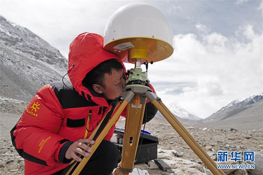 國測一大隊隊員在珠峰大本營附近測試設(shè)備(4月27日攝)。新華社記者普布扎西攝