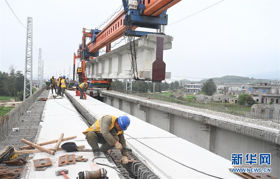 5月20日,福平鐵路洋中特大橋最后一片T型梁在架設中。新華社記者林善傳攝
