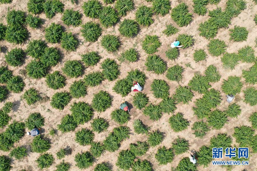 5月21日,河北省清河縣農(nóng)墾金銀花種植專業(yè)合作社社員在采收金銀花(無(wú)人機(jī)照片)。2017年以來(lái),河北省清河縣在推進(jìn)農(nóng)業(yè)產(chǎn)業(yè)結(jié)構(gòu)調(diào)整過(guò)程中,結(jié)合市場(chǎng)需求,立足當(dāng)?shù)赝寥?、氣候特點(diǎn),依托公司“訂單”引導(dǎo)農(nóng)民發(fā)展金銀花種植。目前,清河縣金銀花種植面積近2000畝,帶動(dòng)40多個(gè)村莊的2000余名農(nóng)民人均增收千元以上。新華社記者牟宇攝