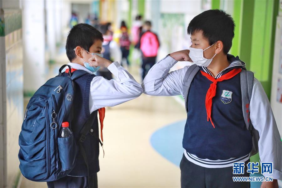 5月25日,北京市朝陽區(qū)實(shí)驗(yàn)小學(xué)貴陽分校的兩個(gè)孩子用“碰肘”的方式打招呼。新華社記者劉續(xù)攝