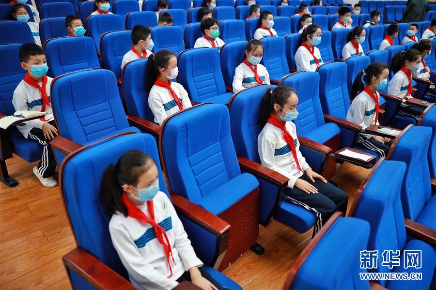 5月25日,廣州市荔灣區(qū)蔣光鼐紀(jì)念小學(xué)的學(xué)生在參加升國旗唱國歌儀式。當(dāng)日,廣州市各小學(xué)一至三年級學(xué)生正式開學(xué)復(fù)課。至此,廣州市中小學(xué)各年級已全部開學(xué)復(fù)課。新華社記者盧漢欣攝