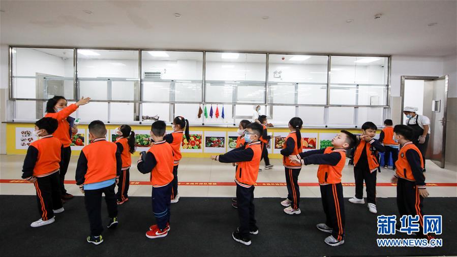 5月25日,廣州市荔灣區(qū)蔣光鼐紀(jì)念小學(xué)的老師在校門口指導(dǎo)返校的學(xué)生進(jìn)行手部消毒。當(dāng)日,廣州市各小學(xué)一至三年級學(xué)生正式開學(xué)復(fù)課。至此,廣州市中小學(xué)各年級已全部開學(xué)復(fù)課。新華社記者盧漢欣攝