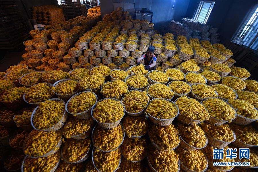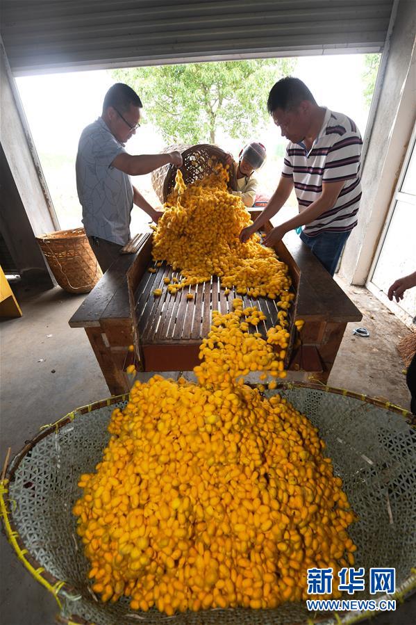 5月27日,桐鄉(xiāng)市鳳鳴街道建勝村70歲的村民宋柏明在收獲“黃金繭”。他今年在桐鄉(xiāng)興民蠶業(yè)專業(yè)合作社的指導(dǎo)下首次養(yǎng)3張黃金蠶繭種,收獲“黃金繭”近400斤,比往年同期增收1500元。近期,蠶桑之鄉(xiāng)浙江省桐鄉(xiāng)市的蠶農(nóng)們迎來了蠶繭豐收的季節(jié),其中新品種“黃金繭”的增收效果尤其明顯。據(jù)介紹,與普通蠶絲相比,色澤金黃的黃金蠶絲中葉黃素含量高,抗菌效果更好,深受市場青睞。2020年春季,浙江省桐鄉(xiāng)市共計發(fā)放黃金蠶繭種1225張,產(chǎn)量預(yù)計75噸,總產(chǎn)值近300萬元,較普通蠶繭增收約20%,成為當?shù)剞r(nóng)業(yè)增收的亮點。浙江省桐鄉(xiāng)市是我國蠶桑的重要產(chǎn)地,“桐鄉(xiāng)蠶桑習(xí)俗”也被國務(wù)院列入第二批國家級非物質(zhì)文化遺產(chǎn)名錄。新華社記者徐昱攝