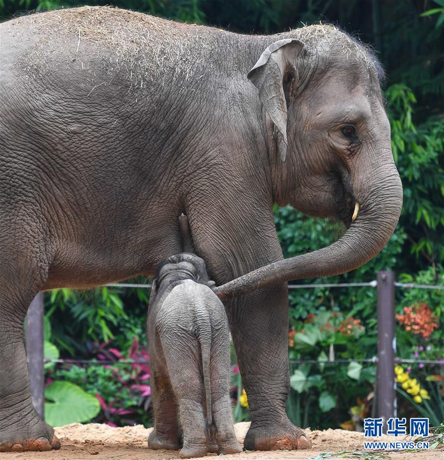 5月27日,廣州長(zhǎng)隆的新生亞洲象寶寶在吃奶。在不到一個(gè)月的時(shí)間內(nèi),廣州長(zhǎng)隆野生動(dòng)物世界的亞洲象家族迎來兩名新丁。4月30日,亞洲象莉娜產(chǎn)下一頭公象,出生時(shí)體重88公斤;5月12日,亞洲象伊拉產(chǎn)下一頭母象,出生體重達(dá)108公斤。大象媽媽莉娜和伊拉均為長(zhǎng)隆野生動(dòng)物世界亞洲象種群繁育基地繁殖的亞洲象。至此,長(zhǎng)隆亞洲象家族已繁衍至第三代,現(xiàn)共有27頭大象。新華社記者劉大偉攝