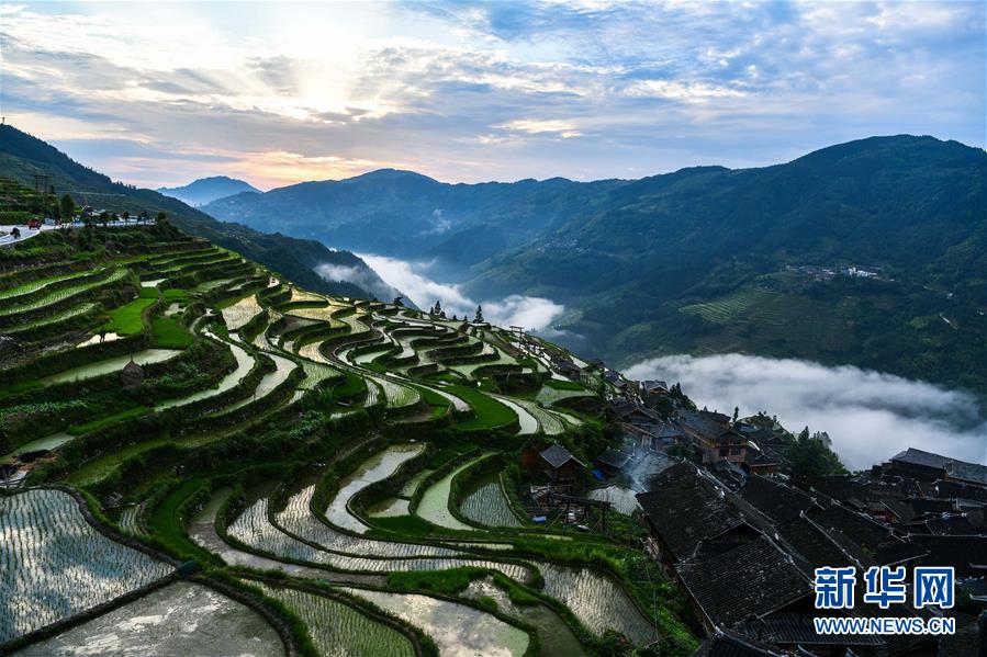 晨光中的從江縣加榜鄉(xiāng)加車梯田(5月28日攝)。夏日時(shí)節(jié),位于貴州省黔東南苗族侗族自治州從江縣加榜鄉(xiāng)加車、加頁、黨扭等苗寨的梯田在晨霧與陽光的映襯下線條分明,光影變幻,景色如畫。新華社記者 楊文斌 攝