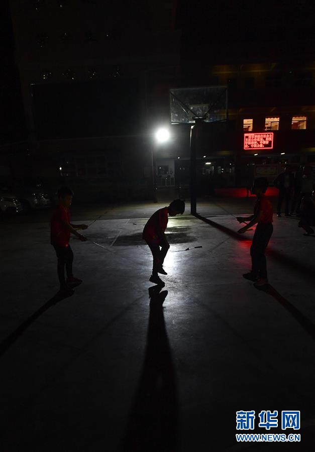 鐘煒鋒在校園小廣場上和同學(xué)練跳繩,當(dāng)天晚上,電影《點點星光》將在七星小學(xué)操場上舉行首映式(2019年11月15日攝)。新華社記者劉大偉攝