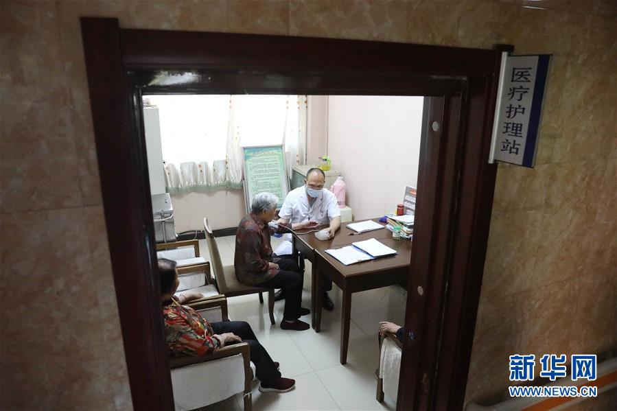 6月1日,在正定縣塔元莊村勁松老年公寓,醫(yī)護(hù)人員在醫(yī)療護(hù)理站為老人測量血壓。新華社記者朱旭東攝。