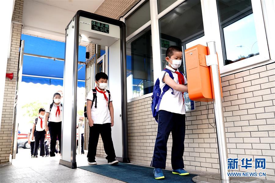 6月2日,上海閔行區(qū)鑫都小學(xué)的學(xué)生走進(jìn)校園。當(dāng)日,上海小學(xué)一、二、三年級學(xué)生返校開學(xué)。新華社記者張建松攝。