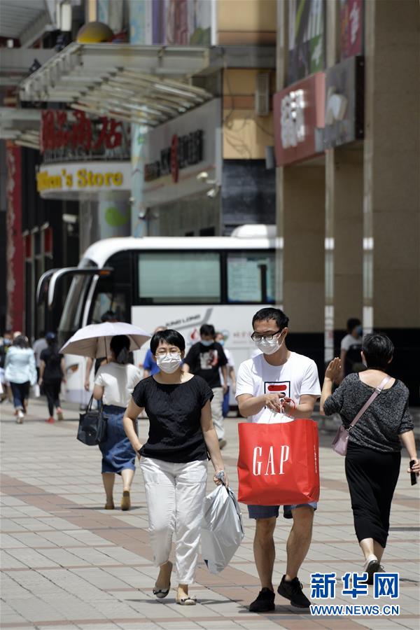 6月3日,市民及游客在王府井步行街購(gòu)物。近日,游人和市民紛紛來(lái)到北京市的王府井、西單、前門大街等著名商業(yè)街購(gòu)物休閑,這些老商業(yè)街開始逐步恢復(fù)昔日的繁華。新華社記者李欣攝。