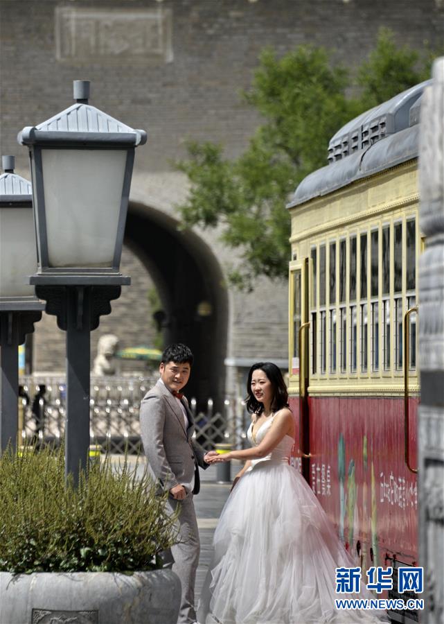 6月3日,一對(duì)年輕人在前門步行街拍攝婚紗照片。近日,游人和市民紛紛來(lái)到北京市的王府井、西單、前門大街等著名商業(yè)街購(gòu)物休閑,這些老商業(yè)街開始逐步恢復(fù)昔日的繁華。新華社記者李欣攝。