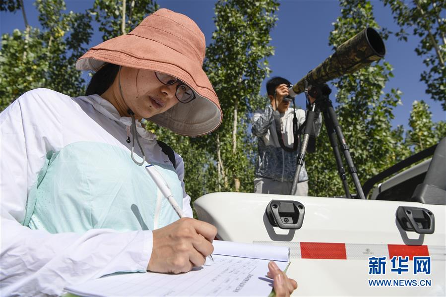 6月3日,李學(xué)明(左)和同事張海榮在監(jiān)測(cè)記錄黃河濕地的鳥(niǎo)類活動(dòng)。新華社記者馮開(kāi)華攝。