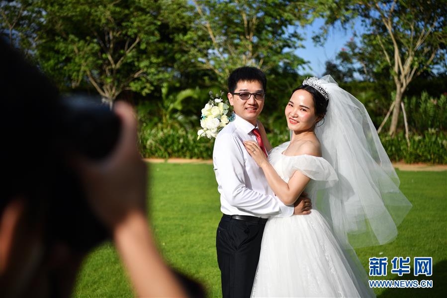 6月6日,武漢大學(xué)人民醫(yī)院護(hù)士柯全和喻晨(右)在三亞亞特蘭蒂斯度假區(qū)拍攝婚紗照。 當(dāng)日,來(lái)自全國(guó)15個(gè)省份的百對(duì)新人在三亞市亞特蘭蒂斯度假區(qū)舉行了一場(chǎng)特殊的集體婚禮,每對(duì)新人中至少有一位參與過(guò)抗擊新冠肺炎疫情的工作。 新華社記者 郭程 攝