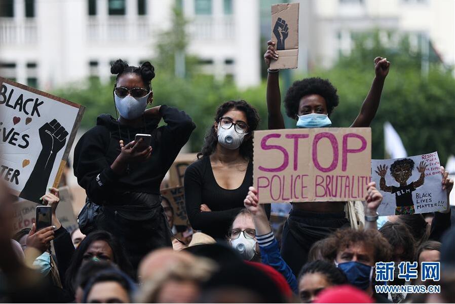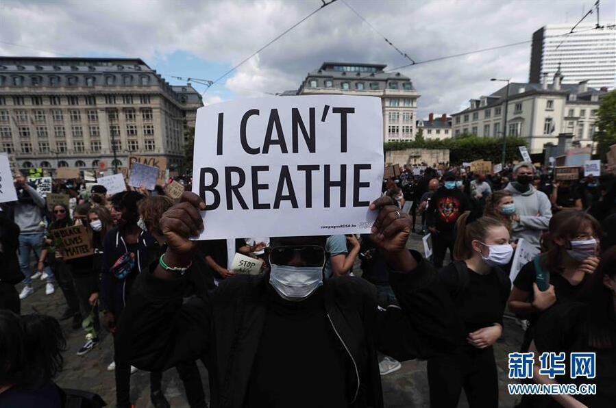6月7日,民眾在比利時布魯塞爾市中心的司法宮附近參加示威活動。比利時民眾當(dāng)日在布魯塞爾市中心的司法宮附近舉行示威活動,抗議美國明尼阿波利斯市警察暴力執(zhí)法致非裔男子喬治·弗洛伊德死亡。新華社記者鄭煥松攝