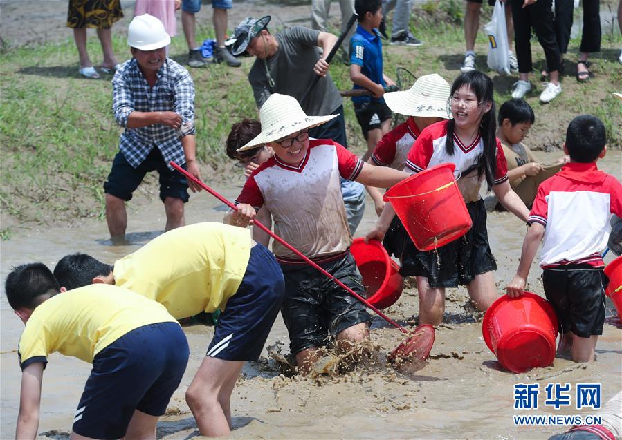 6月7日,孩子和家長(zhǎng)們參加渾水摸魚趣味活動(dòng)。新華社記者徐昱攝