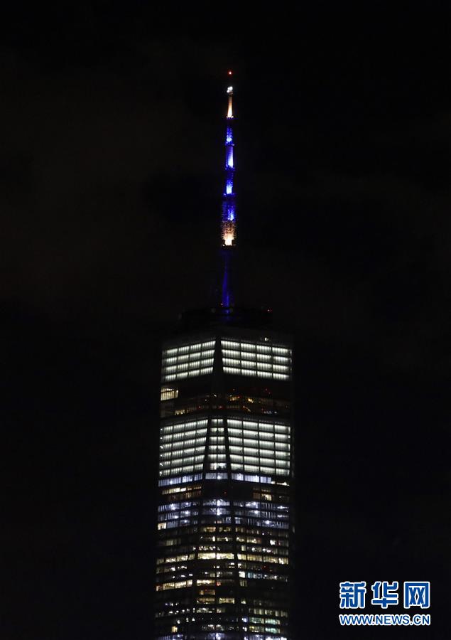 這是6月7日拍攝的點(diǎn)亮藍(lán)色和金色燈光的美國紐約世貿(mào)中心一號樓。新華社記者王迎攝