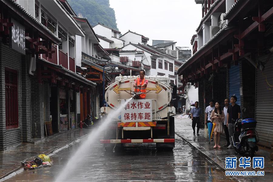6月8日,在廣西陽(yáng)朔縣西街,環(huán)衛(wèi)工人在沖洗被洪水浸泡的街道。6月6日至8日,廣西陽(yáng)朔縣普降暴雨,局部降特大暴雨,全縣9個(gè)鄉(xiāng)鎮(zhèn)出現(xiàn)洪澇災(zāi)害。目前,全縣正有序開展災(zāi)后生產(chǎn)生活恢復(fù)。新華社記者陸波岸攝