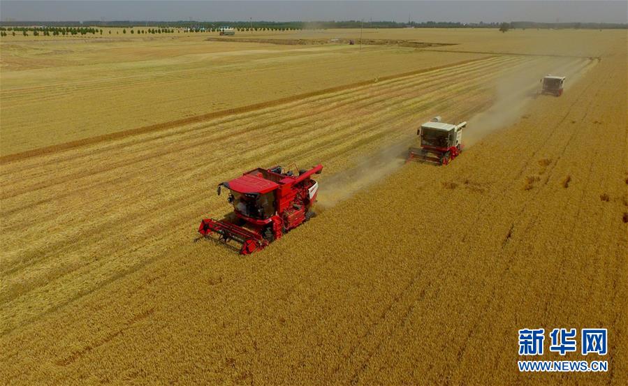 6月8日,聯(lián)合收割機(jī)在河北省南和縣閆里鄉(xiāng)閆里村麥田進(jìn)行夏收作業(yè)(無人機(jī)照片)。“三夏”期間,河北省預(yù)計組織和調(diào)度小麥聯(lián)合收割機(jī)、拖拉機(jī)、夏玉米播種機(jī)等200萬臺農(nóng)業(yè)機(jī)械投入作業(yè)。新華社記者朱旭東攝