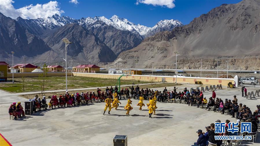 新疆塔什庫爾干塔吉克自治縣文工團(tuán)演員在熱斯喀木村為村民演出(6月6日攝,無人機(jī)照片)。