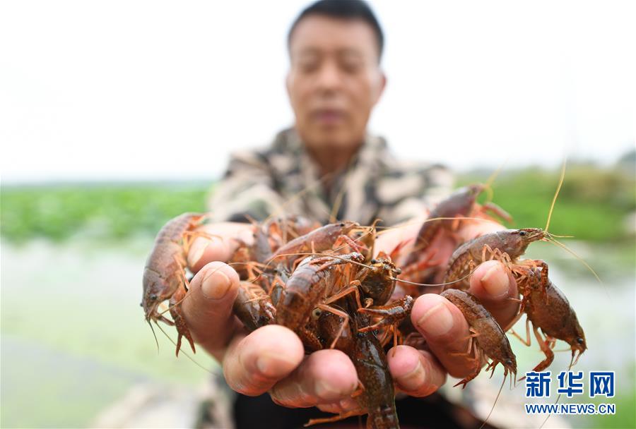 6月9日,在宿遷市宿城區(qū)中揚鎮(zhèn)一家淺水藕套養(yǎng)小龍蝦合作社,負(fù)責(zé)人王乃國在展示蝦苗(無人機(jī)照片)。新華社記者季春鵬攝