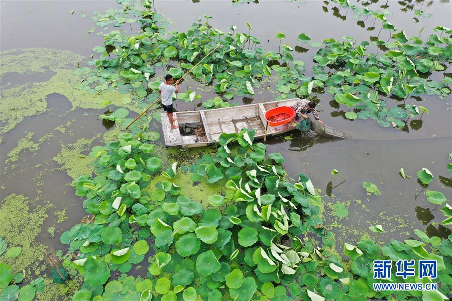 6月9日,在宿遷市宿城區(qū)中揚鎮(zhèn)一家淺水藕套養(yǎng)小龍蝦合作社,負(fù)責(zé)人王乃國在取蝦苗(無人機(jī)照片)。新華社記者季春鵬攝