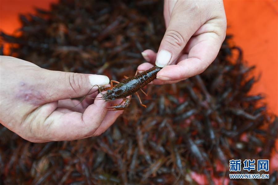 6月9日,在宿遷市宿城區(qū)中揚鎮(zhèn)一家淺水藕套養(yǎng)小龍蝦合作社,工人在給小龍蝦喂飼料。新華社記者季春鵬攝