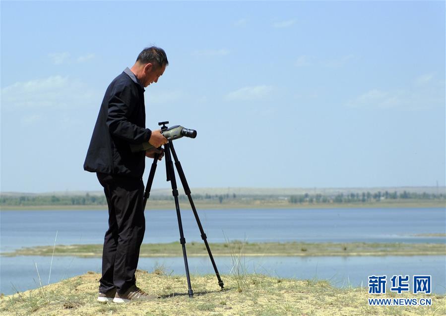6月9日,鄂爾多斯遺鷗國家級(jí)自然保護(hù)區(qū)東勝管理站站長任永奇,用望遠(yuǎn)鏡觀察泊江海子鳥類生活情況。近年來,在當(dāng)?shù)卣亩喾N措施治理下,曾經(jīng)水面萎縮的內(nèi)蒙古自治區(qū)鄂爾多斯市境內(nèi)的泊江海子水量逐漸恢復(fù)。近期,包括遺鷗在內(nèi)的40多種鳥類來此棲息,泊江海子重新成為鳥類的樂園。新華社記者賈立君攝