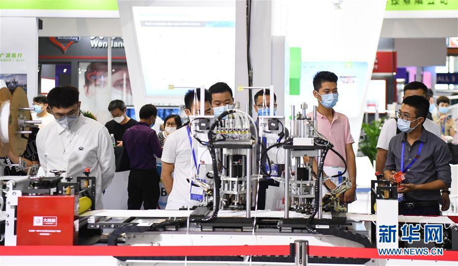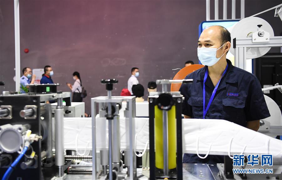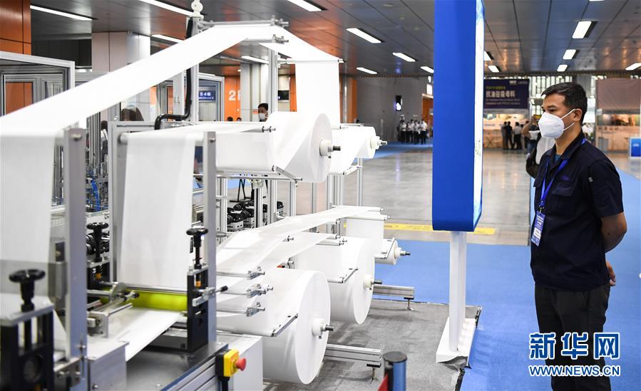 6月10日,觀眾參觀展會上的一臺口罩生產(chǎn)設(shè)備。當日,廣州國際防疫物資展覽會在保利世貿(mào)博覽館舉行。本次展會面積共計3.6萬平方米,設(shè)有防疫產(chǎn)品、設(shè)備、綜合服務、原輔料等4個展區(qū),參展企業(yè)約600家。新華社記者鄧華攝