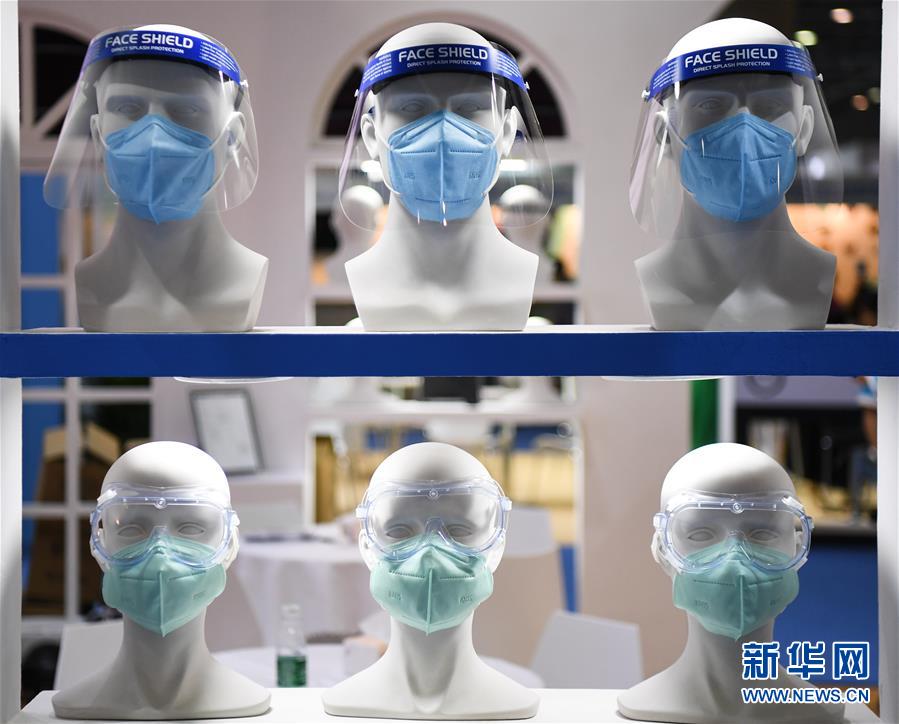 6月10日拍攝的展會上的口罩和防護罩產(chǎn)品。當日,廣州國際防疫物資展覽會在保利世貿(mào)博覽館舉行。本次展會面積共計3.6萬平方米,設(shè)有防疫產(chǎn)品、設(shè)備、綜合服務、原輔料等4個展區(qū),參展企業(yè)約600家。新華社記者鄧華攝