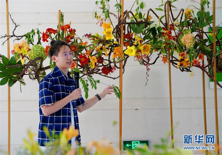 6月13日,第45屆世界技能大賽花藝項目冠軍、上海應(yīng)用技術(shù)大學學生陸亦煒在介紹自己主持設(shè)計和創(chuàng)作的花藝作品。當日,“2020中國(上海)萱草文化節(jié)”在上海應(yīng)用技術(shù)大學開幕,校園里數(shù)百個品種的萱草花競相綻放,萱草科研推廣、萱草文化交流等多項活動同時舉行。新華社記者 劉穎 攝