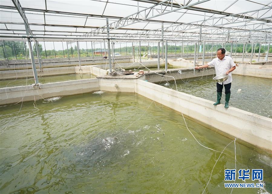 6月16日,在盧龍縣印莊鄉(xiāng)榆林甸村永新水產(chǎn)養(yǎng)殖專業(yè)合作社的養(yǎng)殖基地,養(yǎng)殖戶劉玉永在給淡水鱸魚投放飼料。
