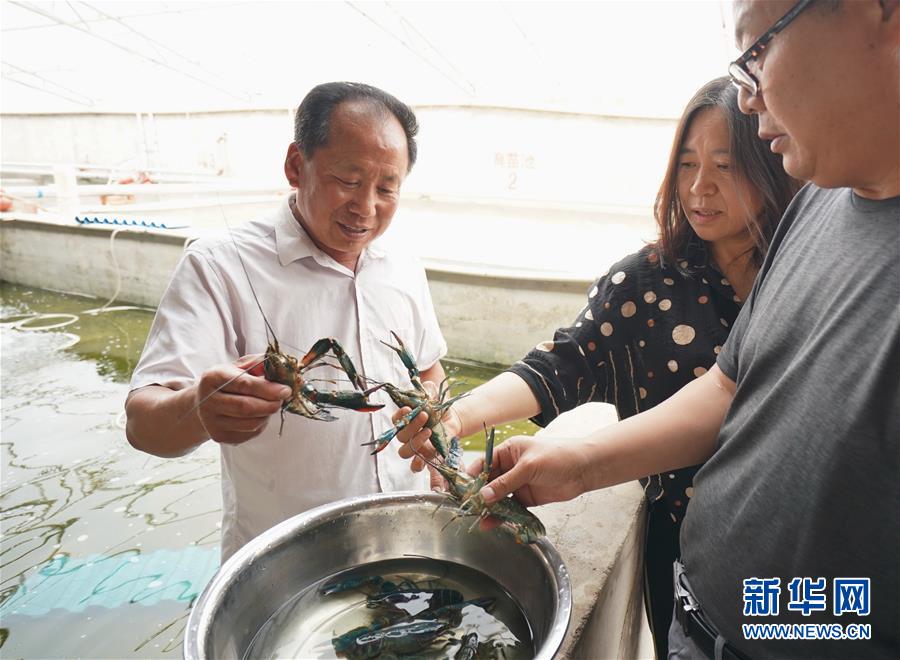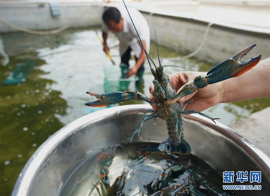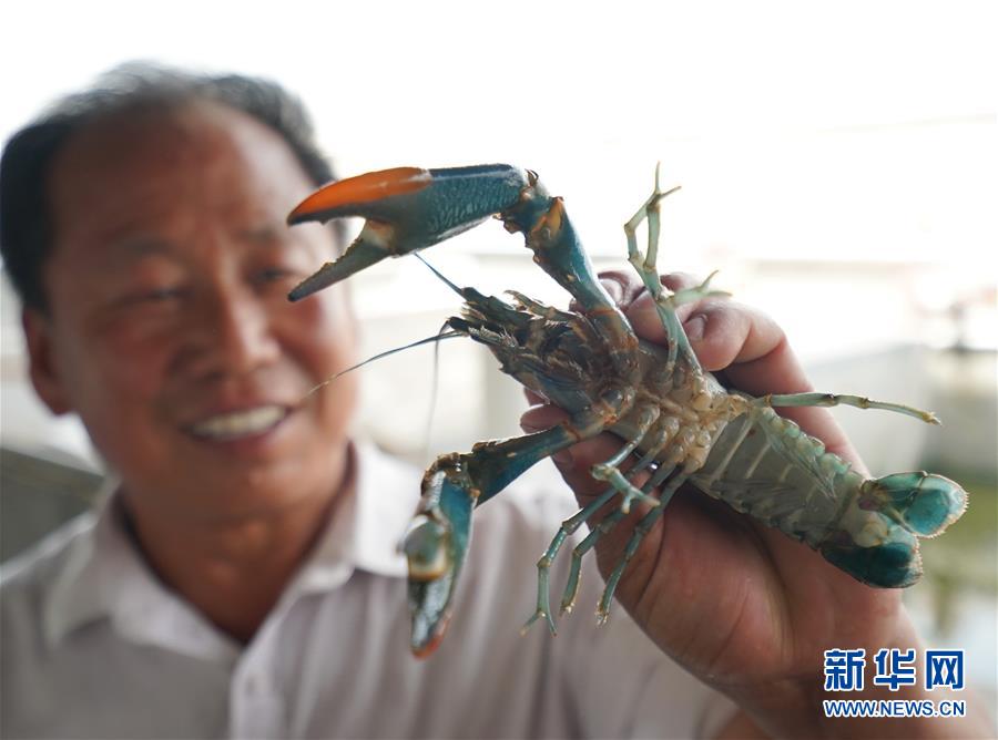 6月16日,在盧龍縣印莊鄉(xiāng)榆林甸村永新水產(chǎn)養(yǎng)殖專(zhuān)業(yè)合作社的養(yǎng)殖基地,養(yǎng)殖戶(hù)劉玉永在展示一只澳洲淡水龍蝦。新華社記者 楊世堯 攝