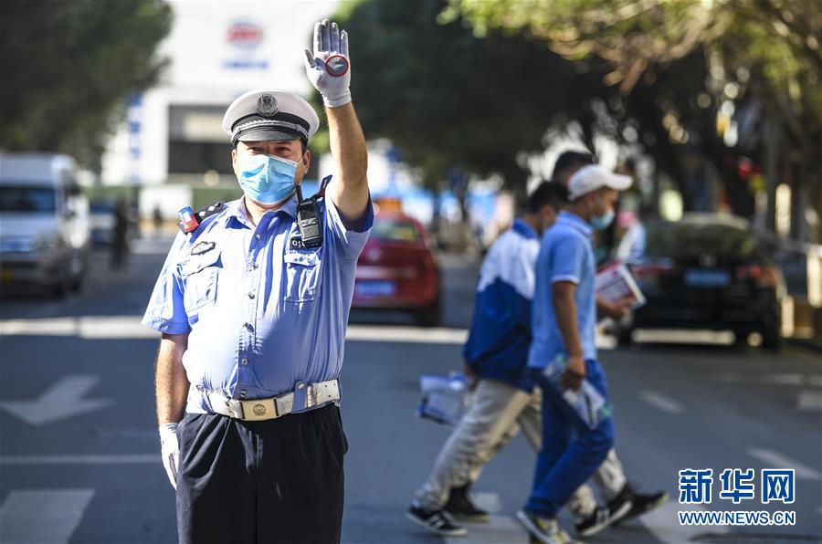 6月20日,在烏魯木齊市第二中學(xué)門(mén)前,烏魯木齊市公安局交警支隊(duì)天山區(qū)大隊(duì)新華路中隊(duì)警官艾力夏提·哈力木然提在指揮交通。當(dāng)日,烏魯木齊市初中升高中考試開(kāi)始。為保障為期三天的中考順利進(jìn)行,烏魯木齊市公安局交警支隊(duì)在各考點(diǎn)執(zhí)勤,為考生保駕護(hù)航新華社記者 王菲 攝