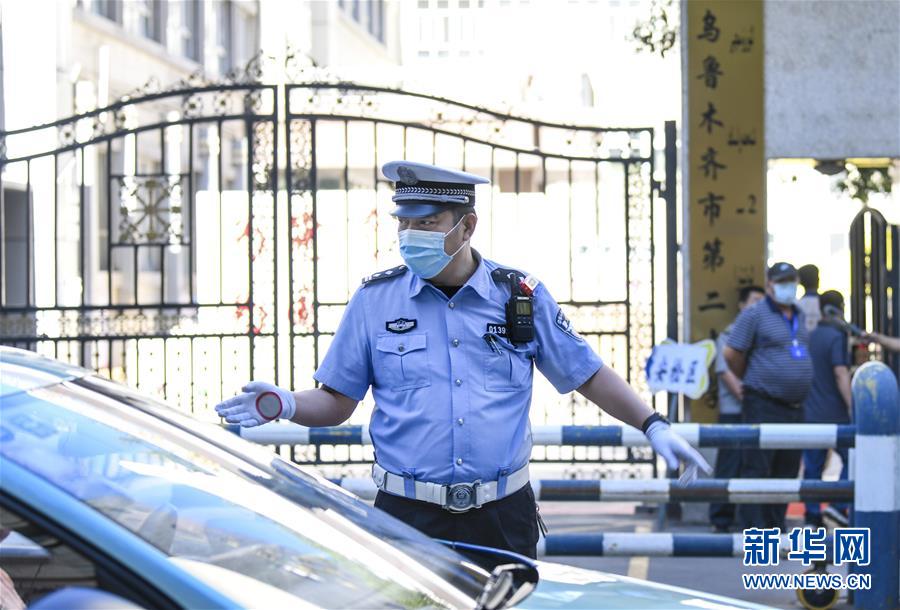 6月20日,在烏魯木齊市第二中學門前,烏魯木齊市公安局交警支隊天山區(qū)大隊新華路中隊警官艾力夏提·哈力木然提在指揮交通。當日,烏魯木齊市初中升高中考試開始。為保障為期三天的中考順利進行,烏魯木齊市公安局交警支隊在各考點執(zhí)勤,為考生保駕護航新華社記者 王菲 攝