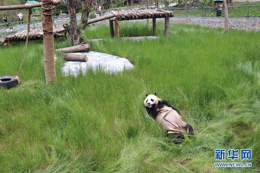 在位于四川省阿壩藏族羌族自治州的九寨溝大熊貓園,大熊貓“海?!痹诖驖L(6月19日攝)。新華社記者沈伯韓攝