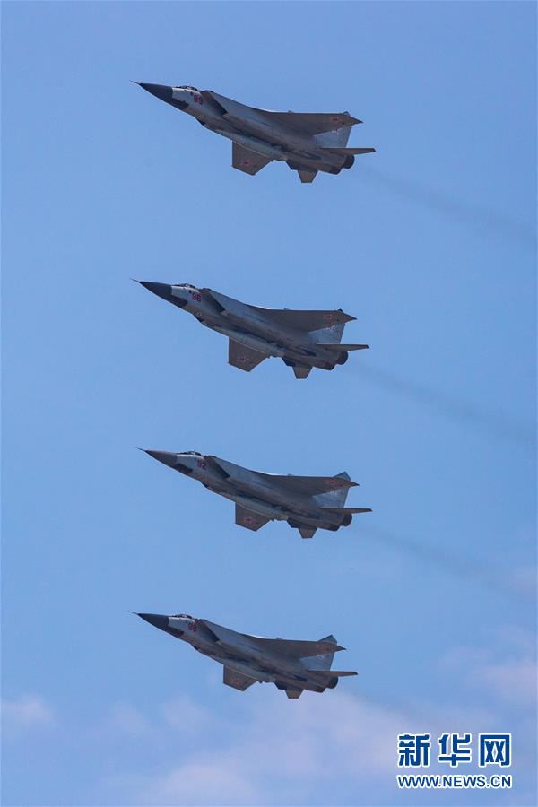 6月20日,在俄羅斯首都莫斯科,米格-31K戰(zhàn)斗機編隊參加閱兵式彩排。俄羅斯將于6月24日舉行紀念衛(wèi)國戰(zhàn)爭勝利75周年閱兵式。新華社記者白雪騏攝