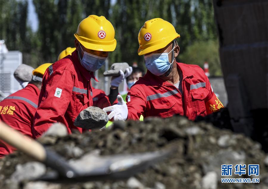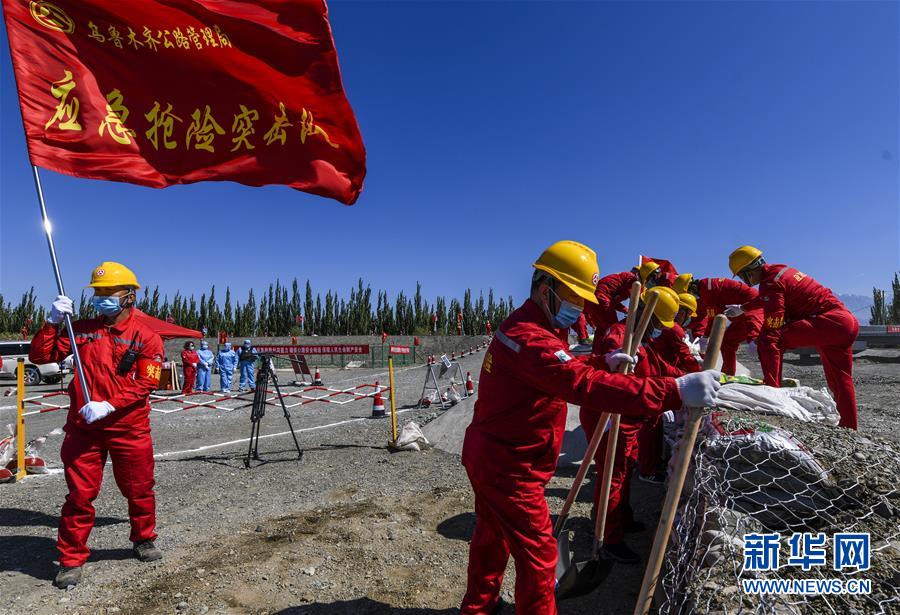 6月22日,應急搶險隊員參加演練。當日,新疆維吾爾自治區(qū)公路管理局組織的2020年國省干線公路突發(fā)地質(zhì)災害應急演練在烏魯木齊舉行,演練模擬烏魯木齊市柴窩堡區(qū)域遭受強降雨,誘發(fā)附近水域突發(fā)洪水,公路路基面臨被洪水沖毀的險情,組織搶險人員和機械設備在指定時間內(nèi)趕赴受災現(xiàn)場實施應急搶險處置。此次演練將進一步增強各相關部門的防災減災意識,提高公路應急搶險處突能力。新華社記者王菲攝