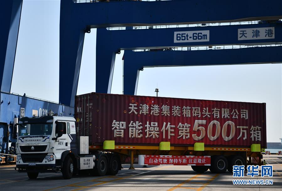 在天津港集裝箱碼頭有限公司北區(qū)智能碼頭自動(dòng)化堆場(chǎng),裝載著集裝箱的無人駕駛電動(dòng)集裝箱卡車向碼頭駛?cè)ィ?019年9月26日攝)。新華社記者李然攝