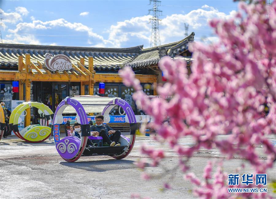 在吉林省延邊朝鮮族自治州和龍市西城鎮(zhèn)金達(dá)萊民俗村,村民在村內(nèi)的咖啡館前體驗(yàn)親子游樂(lè)項(xiàng)目(5月6日攝)。新華社記者許暢攝