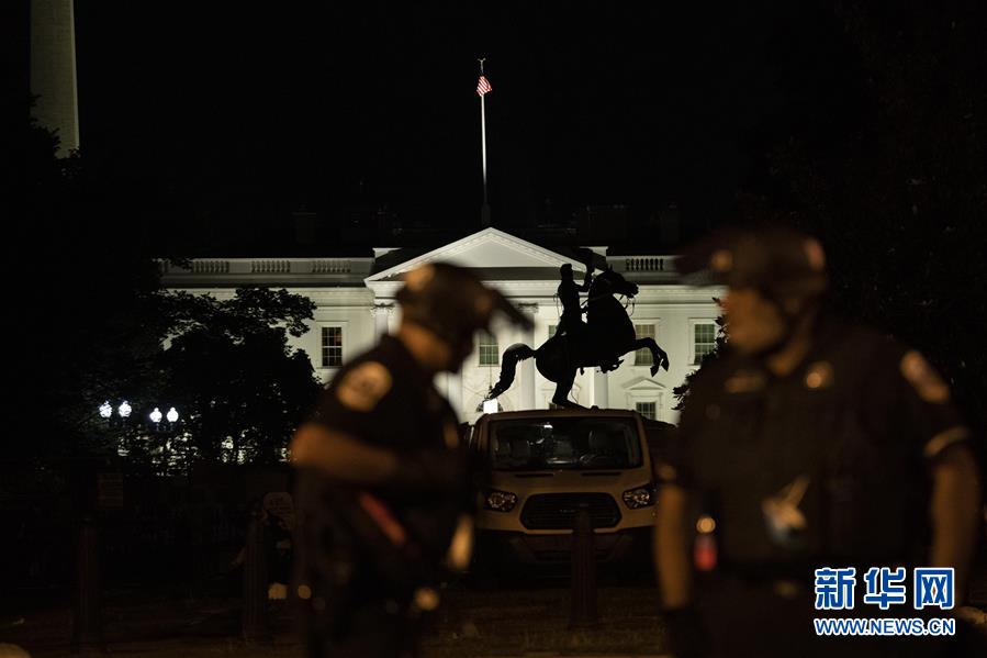 6月22日,警察在美國華盛頓白宮附近警戒。美國警察和示威者22日晚在首都華盛頓市白宮北側(cè)拉斐特廣場發(fā)生沖突并對(duì)峙。美國總統(tǒng)特朗普在社交媒體上說,許多人因破壞廣場上美國前總統(tǒng)安德魯·杰克遜的雕像及附近圣約翰圣公會(huì)教堂被逮捕。新華社記者劉杰攝