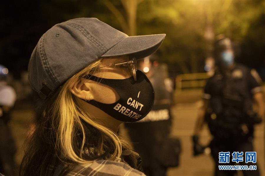 6月22日,一名女子戴著寫有“我不能呼吸”的口罩在美國華盛頓白宮附近參加示威活動(dòng)。美國警察和示威者22日晚在首都華盛頓市白宮北側(cè)拉斐特廣場發(fā)生沖突并對(duì)峙。美國總統(tǒng)特朗普在社交媒體上說,許多人因破壞廣場上美國前總統(tǒng)安德魯·杰克遜的雕像及附近圣約翰圣公會(huì)教堂被逮捕。新華社記者劉杰攝