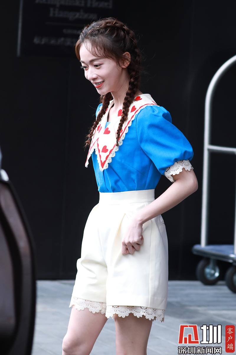 吳謹言身穿藍色上衣搭配白裙秀美腿,少女感十足。