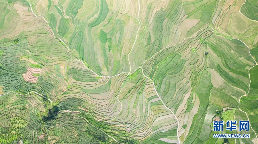 貴州省盤州市新民鎮(zhèn)的梯田風(fēng)光(6月29日攝,無(wú)人機(jī)照片)。夏日時(shí)節(jié),貴州省盤州市新民鎮(zhèn)的梯田風(fēng)景如畫。新華社記者陶亮攝