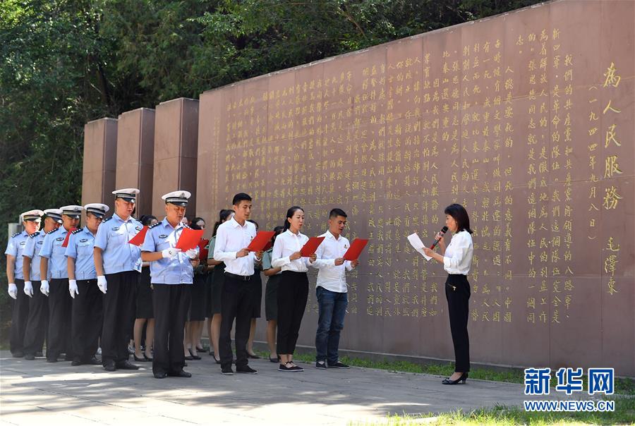 6月29日,在延安市張思德廣場,黨員干部在誦讀《為人民服務(wù)》。臨近“七一”,革命圣地延安的黨員干部紛紛來到紅色景區(qū),舉行主題黨課、現(xiàn)場教學(xué)、重溫入黨誓詞等活動。新華社記者張博文攝