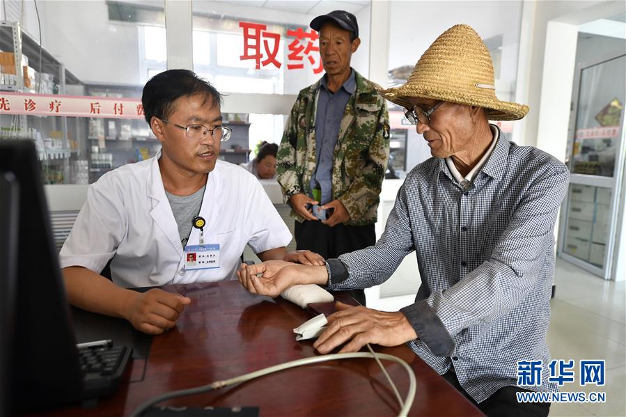 寧夏銀川市永寧縣閩寧鎮(zhèn)原隆村衛(wèi)生室,羅校必(右一)在看病(2019年9月3日攝)。新華社記者王鵬攝