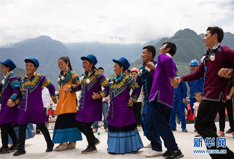 6月29日,阿布洛哈村村民身著彝族傳統服飾載歌載舞慶祝通村公路通車。新華社記者江宏景攝
