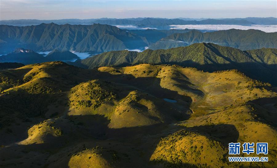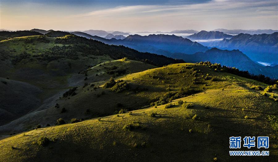 6月30日,朝霞照耀下的神田草甸與遠(yuǎn)處的群峰(無(wú)人機(jī)照片)。位于陜西省安康市嵐皋縣與重慶市城口縣交界處大巴山神田主脊北坡的神田草甸,面積超過1.1萬(wàn)畝。夏日的朝霞中,起伏的草甸仿佛一塊寬大無(wú)邊的綠色地毯,鑲嵌在大巴山上,如詩(shī)如畫。新華社記者陶明攝