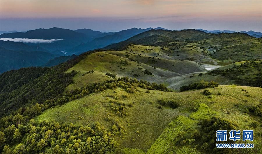 6月30日,晨曦中的神田草甸(無(wú)人機(jī)照片)。位于陜西省安康市嵐皋縣與重慶市城口縣交界處大巴山神田主脊北坡的神田草甸,面積超過1.1萬(wàn)畝。夏日的朝霞中,起伏的草甸仿佛一塊寬大無(wú)邊的綠色地毯,鑲嵌在大巴山上,如詩(shī)如畫。新華社記者陶明攝