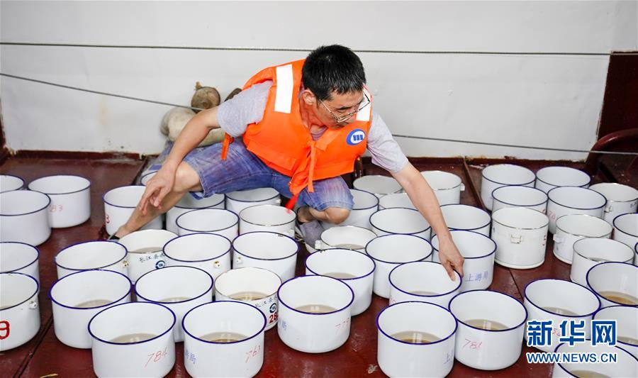 7月2日,長江清溪場水文站站長朱輝在水文作業(yè)船上清點(diǎn)長江水樣。新華社記者劉潺攝